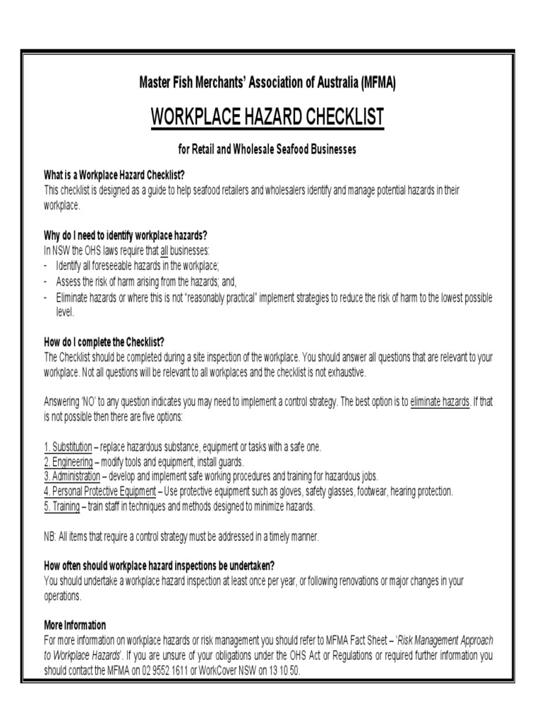Mfma Workplace Hazard Checklist Personal Protective Equipment Be Safe Managers Guide To Hazardous Substances