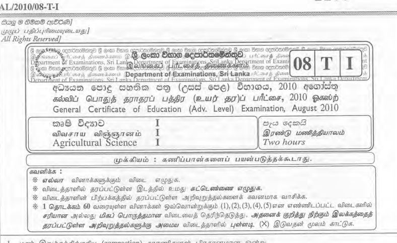 Agricultural Science Past Paper August 2010 G C E A L Grade 7 Science Past Papers Tamil Medium