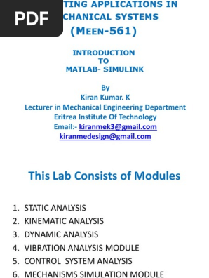 Computing Applications In Mechanical Systems Matlab Simulink Introduction To Matlab 6 6 5 Update Edition